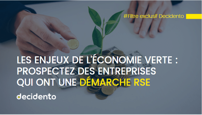 Ce critère de sélection vous permet ainsi de filtrer vos recherches, qu’elles soient sur les entreprises ou sur les Opportunités Business : toute activité relative à l’économie verte sera détectée et remontée. En associant ce critère RSE & Vert avec d’autres filtres (par secteur d’activité et géolocalisation par exemple), Decidento vous permet de détecter avec précision les entreprises écoresponsables dans votre cible.